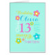 Texte moderne et fleur 13e anniversaire nom personnalisé carte filles d'anniversaire, avec des fleurs graphiques et votre propre choix de nom en aqua, jaune, rose, bleu, blanc sur un arrière - plan couleur aqua bleu vert. Personnalisez avec votre propre nom (veuillez noter que tous les noms ne correspondent pas à la nature de la police) et âge, actuellement lit Olivia 13, d'autres noms longueurs, âges et options de couleur sont disponibles. Un emballage cadeau correspondant est également disponible. Une excellente façon de donner une touche personnalisée à un 13ème anniversaire. Uniquement conçu par www.mylittleeden.com