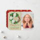 Votre propre photographie occupe le centre de la scène sur le côté droit de cette carte de vacances moderne et festive. Le côté gauche a l'image d'une couronne à feuillage persistant décorée de fleurs blanches et de baies rouges. Les couleurs dominantes sont le vert et le rouge. Cinq champs de texte personnalisés sont en rouge et en vert. Le dos de la carte a un joli motif de flocon doré sur un arrière - plan rouge assorti.