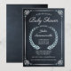Invitations de douche bébé en tableau noir avec décorations florales, couronne de vigne et bordure vintage. Mignonne, subtile, simple, décontractée et classe ! Des accents turquoise et bleu, parfaits pour les baby showers garçons.