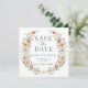 Chic et sophistiqué, cette invitation à la photo Save the Date pour un mariage boho présente un élégant thème botanique rustique avec des fleurs chaudes d'orange et de terre cuite.
