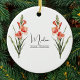 Fleur de mois de naissance août ornement de gladiolus avec l'illustration d'une fleur de gladiolus. Sous la fleur, le nom est écrit dans une police de script élégante. Sous le nom, il indique "Août - Gladiolus", indiquant que le mois de naissance du propriétaire est Août et que sa fleur de naissance est le gladiolus. C'est un ornement personnalisé, customisé comme un cadeau réfléchi pour quelqu'un du nom de Madison né en août.