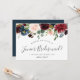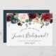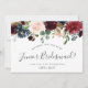La carte de proposition de fête de la mariée à fleurs chic comporte une bordure supérieure de marsala bordeaux, des fleurs rose vif et bleu marine, avec un feuillage botanique luxuriant et de la verdure. Personnalisez avec les détails de votre demande de demoiselle d'honneur junior (montré avec "serez-vous ma demoiselle d'honneur jr? Je ne peux pas dire que je ne fais pas sans vous") en écriture manuscrite moderne et en écriture sans serif traditionnelle. Les invitations se retournent vers le riche bijou tonique bleu marine.