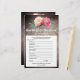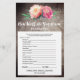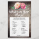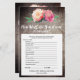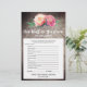 Ce jeu de fleurs rustiques "comment bien connaissez-vous la mariée" est parfait pour une douche à thème de campagne fleurie. Le devant de la carte de jeu comporte "comment connaissez-vous bien la mariée", et le dos de la carte contient "ce qui est dans votre sac à main". Le design se compose d'un élégant agencement de pivoines d'aquarelle rose vif sur un arrière - plan texturé en bois. Personnalisez l'avant de la carte avec le nom de l'épouse et la date de la douche de l'épouse.
