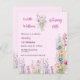 Une invitation à célébrer le 1er anniversaire d'une petite fille. Un arrière - plan rose clair. Décoré de fleurs sauvages rose, violet, bleu. Personnalisez et ajoutez le nom de la mère à être et les détails de la fête. Texte : Notre petit fleur sauvage tourne UN. 1 feuille = 1 invite imprimé bord à bord.