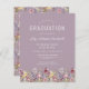Une belle bordure florale d'aquarelle de fleurs sauvages décore le bord inférieur de cette invitation branchée de fête de graduation boho. Customisez le texte blanc sur un arrière - plan mauve, avec le nom du diplômé en écriture manuscrite ; l'année scolaire et de classe en sans serif ; et la date, le lieu et les détails RSVP en police serif. Le verso de la carte comporte un motif de fleurs sauvages sur un arrière - plan mauve.