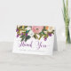 Ces cartes de remerciement de mariage élégantes présentent de jolies fleurs à l'aquarelle en rose, gris, blanc, violet et orange, et une touche de fausses paillettes roses. Une typographie violette élégante dit "Merci". L'intérieur est vierge pour que vous puissiez ajouter votre propre message. L'art floral par www.createthecut.com.