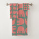 Ce kit de serviettes a un design Boho de fleurs de corail se répétant à travers le design sur un champ de vert.