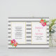 Fleurs d'arrosage tropicale roses et violettes exceptionnelles et rayures gris, blanc plié cérémonie mariage et programme de fête. De belles fleurs tropicales ornent ce mariage moderne et élégant design floral. Votre texte est placé sur des cadres blancs avec des contours dorés. Choisissez le papier de valeur comme il se plie bien et le plier en deux manuellement.