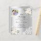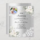 Pour un 25ème anniversaire de mariage élégant et romantique. Un faux arrière - plan argenté décoré de fleurs blanches, de roses et de dentelle blanche. Personnalisez et ajoutez votre photo, vos noms et vos détails. 1 feuille = 1 invite imprimé bord à bord.
