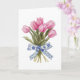Cette élégante carte de vœux présente une superbe illustration d'un bouquet de tulipes roses vibrantes, attachées ensemble avec un délicat ruban bleu de style chinoiserie orné de motifs floraux complexes. Le fond doux et crémeux rehausse les couleurs vives des fleurs et les détails complexes du ruban, créant un design intemporel et sophistiqué parfait pour toutes les occasions. Que vous envoyiez des vœux d'anniversaire, exprimiez votre gratitude ou simplement égayiez la journée de quelqu'un, cette belle carte dégage un charme et une attention délicate, ce qui en fait un choix charmant pour vos proches.