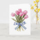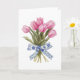 Cette élégante carte de vœux présente une superbe illustration d'un bouquet de tulipes roses vibrantes, attachées ensemble avec un délicat ruban bleu de style chinoiserie orné de motifs floraux complexes. Le fond doux et crémeux rehausse les couleurs vives des fleurs et les détails complexes du ruban, créant un design intemporel et sophistiqué parfait pour toutes les occasions. Que vous envoyiez des vœux d'anniversaire, exprimiez votre gratitude ou simplement égayiez la journée de quelqu'un, cette belle carte dégage un charme et une attention délicate, ce qui en fait un choix charmant pour vos proches.