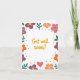 Cette carte de voeux chaleureuse "Get well" présente un arrière - plan blanc agrémenté d'une délicieuse palette de fleurs de dessins animés colorés, de feuilles et d'un coeur 🌸 Les fleurs sont dans une gamme de teintes vibrantes, dont le violet, le rose, le bleu, l'orange et la pêche, chacune avec des centres jaunes ensoleillés et des pétales doux et arrondis. Certaines fleurs regardent les bords de la carte, ajoutant une touche amusante et dynamique au design. Un petit coeur rose se trouve doucement sous le texte ludique "Allez-y bientôt !" dans une police jaune joyeuse avec un contour noir gras. Les feuilles verts sont éparpillés parmi les fleurs capricieuses, créant une ambiance animée et édifiante. De petits points jaunes et des étincelles grises ajoutent du charme et de la luminosité à ce charmant message de bien-être ! 🌼 💖