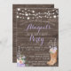 Invitation chic campagne avec design en bois, bottes et fleurs.