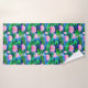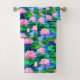 Serviette sertie dans un motif de fleurs de lotus roses en fleurs et de coussins de lys vert luxuriant flottant sur une surface d'eau bleu richement texturée, dans les tons rose bijou et vert émeraude