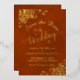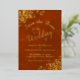 Cette belle carte de faire-part de mariage comporte une impression véritable en feuille d'or sur un fond marbré orange rouille ou brun brûlé. Le beau design présente une calligraphie scripturale avec des fioritures de dentelle florale dans les coins. Une façon merveilleuse, élégante et chic de faire savoir à vos amis et à votre famille que vous vous mariez bientôt.