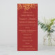 Un élégant programme de mariage doré, floral avec un bouquet de fleurs d'or et feuille au sommet sur une base rouge. Tous les détails des deux côtés de la carte peuvent être facilement personnalisés selon vos besoins. L'envers est muni d'un seul bouquet d'or en bas. Ce programme de mariage élégant et contemporain fait partie d'une suite de mariages complète, que vous pouvez voir en entier ici : https://www.zazzle.com/collections/gold_glitter_floral_sparkles_red_wedding-119325129141873468