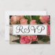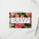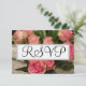 Réponse de mariage écrite en élégante écriture noire à l'intérieur d'un cadre géométrique de couleur blanche et argent sur fond de fleurs de rose rose pâle. Parfait pour un mariage de printemps ou d'été. Personnalisez le verso en couleur or et texte noir sur fond blanc croquant. Photographie et conception originales par TamiraZDesigns.