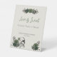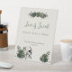 Ce signe de table élégant de Fête de mariage de la Saint-Patrick irlandais gothique présente des illustrations thématiques irlandaises et gothiques dessinées à la main à l'encre noire, mettant en vedette un crâne orné de roses vertes, de feuilles, de baies, de fleurs sauvages et de trèfles verts. Le dos présente un motif assorti avec ces mêmes éléments sur le même fond rose.