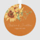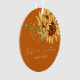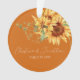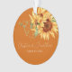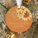 Cet ornement romantique de conservation mariage présente un design floral. L'arrière - plan est une élégante couleur orange brûlée avec des tournesols couleur or. Un délicat bouquet sauvage est représenté en haut, avec les noms du couple imprimés ci-dessous.