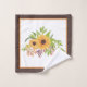 Fleurs de soleil aquarelle, feuilles d'automne, baies et serviettes de bain rayées. Il présente des tournesols jaunes aquarelles, des feuilles d'automne et des baies. Tout autour, une motif rayée marron et blanche, agrémentée de rayures orange, jaune et verte, est agrémentée d'un brun.