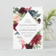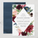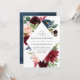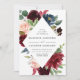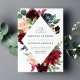 Un élégant faire-part de mariage floral affiche vos noms et détails de mariage encadrés par de riches fleurs aquarelles bordeaux, rose blush et bleu marine complétées par un feuillage vert luxuriant. Le verso des invitations présente un fond aquarelle bleu marine en option.