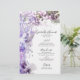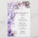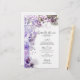 Customisez l'élégant menu Mariage couleur pourpre violet avec les détails du repas que vous pourrez servir à votre jardin fête inspiration déjeuner de douche nuptiale, fiançailles, brunch mariage, dîner de répétition ou réception en ajoutant la salade ou le premier plat, entrée ou deuxième plat et dessert ou troisième plat. Personnalisez-le avec les noms de la mariée et du marié, le lieu de l'événement et la date de la cérémonie de mariage. Ce menu mariage à fleurs personnalisé élégant présente une photo florale peinte en aquarelle numériquement des pétales de fleurs lilas violettes lumineuses ornant les coins d'un arrière - plan blanc.