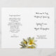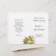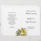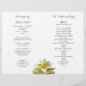 Programme de mariage plié avec fleurs de plumeria jaune. Couleur écru avec modèle de texte noir sur quatre pages - lorsque plié. Le texte est imprimé sur les deux côtés de ce papier de 8,5 x 11 pouces, avec des mises à niveau optionnelles, pour créer un programme plié par feuille. La première page a le titre, les noms complets du couple, et un endroit pour la date, l'heure et le lieu de la célébration. Inclure un paragraphe pour remercier la famille et les amis qui apparaîtra à l'arrière du programme. Retournez le papier et créez deux colonnes de texte pour "la cérémonie" ou "l'ordre de cérémonie", et listez "la fête de mariage".