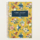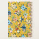 Joli planneur floral imprimé avec un motif floral attrayant dans un jaune moutarde fort avec des fleurs rétro en bleu, corail et bleu avec beaucoup de feuilles bleus et verts, et des baies pâles. Ajoutez votre nom au étiquette bleu foncé.