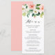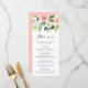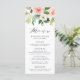 Élégante carte de menu de mariage personnalisée avec une bordure supérieure de fleurs peintes à l'aquarelle et de feuillage en rose saumon, blanc et vert vibrant. Personnalisez les menus de mariage sur mesure en ajoutant vos noms, date de mariage et détails du menu de mariage.