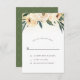 Un magnifique design de RSVP présentant une typographie élégante et une bordure de fleurs aquarelles roses. Derrière les fleurs, il y a une image de confettis dorés. Ces cartes se retournent sur un motif blanc simple sur fond vert.