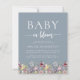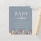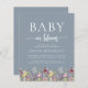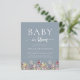 Une belle bordure florale d'aquarelle fleur sauvage décore le bord inférieur de cette invitation à baby shower boho tendance. Les mots "Baby in florom" apparaissent dans les polices serif et script, avec des swashes avant et après le script. Personnalisez le texte avec le nom de la future maman et les détails de la douche en blanc sur un arrière - plan bleu poussiéreux. L'envers offre de l'espace pour la tombola de couche, les livres pour bébé, et les détails du registre (ou n'importe laquelle des trois catégories de votre choix), ainsi qu'un code QR pratique que les clients peuvent scanner pour visiter le registre.