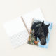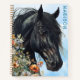 Amateurs de chevaux carnet journal personnalisé. La tête d'un cheval noir se détache des fleurs sauvages sur un arrière - plan bleu ciel dans cette conception. Customisez avec son nom sur le bord en bleu, grunge texte imprimé. Plus de fleurs sauvages décorent l'arrière. À l'intérieur, choisissez parmi plusieurs styles de page. Cet exemple montre la combinaison des pages d'écriture et de dessin. Ou, choisissez toutes les pages vierges, toutes les lignes, et plus encore. Taille est de 8,5 par 11 pouces pour des charges d'espace pour écrire des pensées, des plans et des rêves.