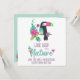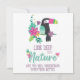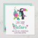 Cette carte inspirante présente un joli imprimé tropical aux couleurs vives, avec un joli dessin animé toucan, des feuilles et des fleurs tropicaux colorés, et un petit oiseau rose. La légende, d'Einstein, dit : "regarde profondément dans la Nature et tu comprendras tout mieux", en polices violette et bleu clair.