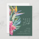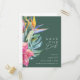 Cette carte postale d'invitation à sauver la date florale tropicale colorée | verte est parfaite pour votre destination moderne boho, mariage vert, violet, pêche. Le design présente un élégant bouquet de verdure et de fleurs classiques de plage à l'aquarelle qui peuvent inclure l'eucalyptus vert sauge, la protéa mauve et rouge, l'hibiscus rose blush, l'oiseau de paradis orange et bleu, et la feuille de palmier vert foncé. Le design est idéal pour un mariage de voyage simple, créatif et unique pour le printemps, l'été, l'automne ou l'hiver ! Veuillez trouver d'autres papeterie de mariage assortie ou coordonnée dans le reste de la collection.