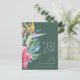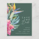 Cette carte postale d'invitation à sauver la date florale tropicale colorée | verte est parfaite pour votre mariage moderne bohème de destination, vert, violet, pêche. Le design présente un élégant bouquet de verdure et de fleurs classiques de style aquarelle de plage qui peuvent inclure l'eucalyptus vert sauge, le protea mauve et rouge, l'hibiscus rose blush, l'oiseau de paradis orange et bleu et la feuille de palmier vert foncé. Le design est idéal pour un mariage de voyage simple, créatif et unique au printemps, en été, en automne ou en hiver ! Veuillez trouver d'autres papeterie de mariage assortie ou coordonnée dans le reste de la collection.