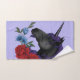 Une licorne noire avec des fleurs rouges, bleues et violettes sur fond de violet clair