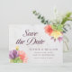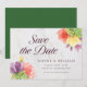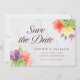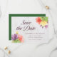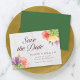 Cette élégante carte de rappel floral présente des fleurs vibrantes avec les mots "save the date" en écriture tendance, le tout sur un fond de marbre pâle sur le devant et un dos vert.