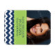 Enregistrez les magnets de date d'anniversaire en élégants et décontractés zigzags rayures chevron motif en bleu marine foncé, blanc et vert citron. Entièrement personnalisable avec votre nom, photo et date de fête d'anniversaire, disponible dans une large gamme de produits d'anniversaire correspondants. Contactez-nous pour une couleur ou un design personnalisé.