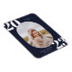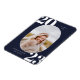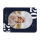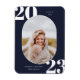 Cadre photo arrondi, aimant faire-part de diplôme de la classe supérieure. Arrière - plan bleu marine classique et typographie blanche avec lignes modèles pour la classe de l'année, le nom du diplômé et l'école.