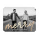 Offrez un cadeau que vos amis et votre famille aimeront cette saison des Fêtes. L'aimant photo de vacances Merry Luxe dispose du mot "Merry" dans une police de script de feuille d'or avec des espaces réservés pour votre photo préférée et le texte personnalisé.