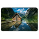 Magnet représenté avec une photo d'une belle scène de lac et de montagnes avec un bateau cabine en bois rustique. Taille 4x6. Image stock
