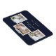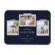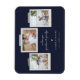 Photo aimable sentiment instantané aimant. Caractéristiques, 3 photos encadrées avec accents de ruban lavi style scrapbook, deux lignes de texte modèles pour votre message, noms et année avec détail coeur en blanc sur bleu marine arrière - plan.