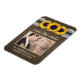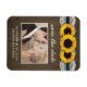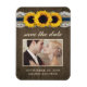 Tournesol Burlap Photo Magnet Réservez la date - présente un arrière - plan en bois de grange avec tournesol, dentelle, burlap et un ruban bleu marine imprimé. Voir l'ensemble de la collection correspondante sur cette page.