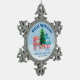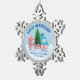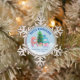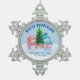 Ce magnifique ornement SnowflakeFramed a deux bonhomme de neige, devant le sapin de Noël. Les deux hommes de neige portent leurs casquettes d'hiver et leurs foulards. Tout le texte de cet ornement peut être customisé.