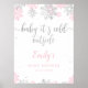 affiche moderne de bienvenue baby shower avec motifs de flocons de neige en parties scintillant d'hiver rose et argent avec le texte "Baby it cold out out"