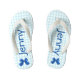 De mignons tongs pour n'importe quelle petite fille. Sur les tongs, il est décoré dans un en vichy bleu et blanc avec une zone personnalisée pour un nom. Des graphiques de petits arcs bleus sont placés sur la zone du talon de la tonge. Adorable !