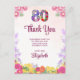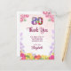 Floral 80e anniversaire merci carte postale 80 fleur chic. Montrez votre gratitude dans le style avec cet élégant carte de remerciements de 80e anniversaire avec des accents floraux vibrants et un message sincère. L'avant de la carte affiche un grand "80" dans un design floral coloré et les mots "Merci" dans un script en gras, suivi d'un message personnalisable. Le côté arrière présente une note d'appréciation touchante pour célébrer un jalon de 80 merveilleuses années remplies d'amour, de rire et de souvenirs. Cette carte est le moyen parfait pour express vos remerciements pour avoir assisté à votre journée spéciale et pour tous les cadeaux généreux reçus. Personnalisez facilement cette carte de remerciements pour refléter vos propres sentiments uniques. Bon appétit !