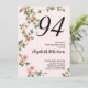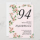 This pretty floral 94th birthday invitation is perfect for a nice party and will set a fun and celebratory tone. This design features pink blossoms on stems, and is a nice feminine choice for a special event to celebrate a milestone birthday. Customize for your own birthday year, and search for "94" in my shop to see coordinating designs.