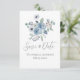 Un joli bouquet d'aquarelle de fleurs de pétales bleues avec script simple et typographie pour le parfait Save the Date mariage faire-part.