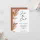 Mariage sur le thème Boho élégant sauvez la date avec un arrangement floral avec l'herbe de pampas et un cap de calligraphie moderne. Le dos de l'invitation est une couleur terre cuite ordinaire qui peut aussi être modifiée. Ce design est idéal pour un mariage moderne à thème boho.